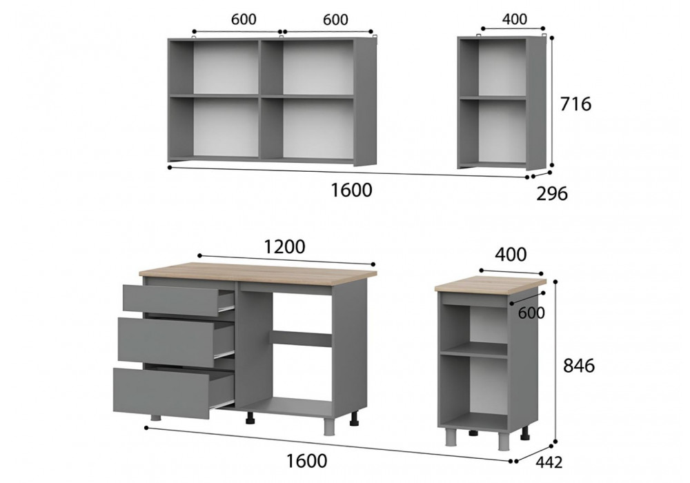 • Все модули комплектуются столешницей толщиной 26 мм, длиной 120 и 40 см.
